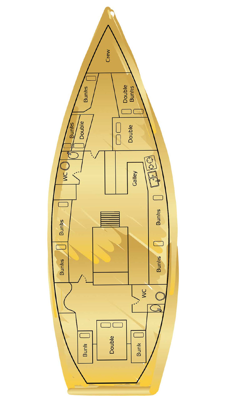 Accommodation on all Prosail vessels is made up of single and double beds in open shared dorm style cabins/sections below deck.
